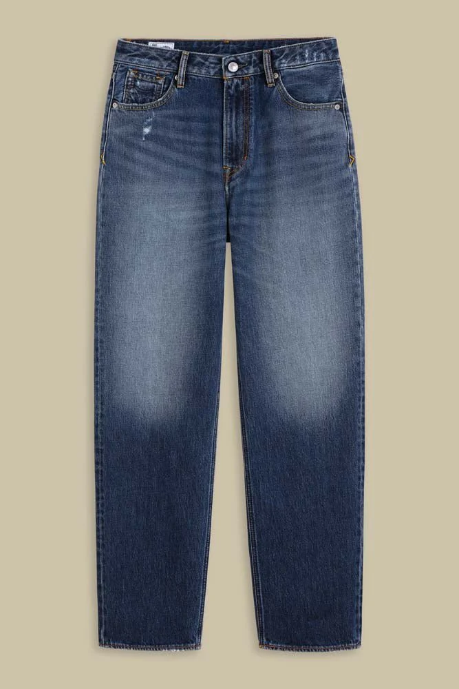Zip fly Vegan patch Recycled metal trims.