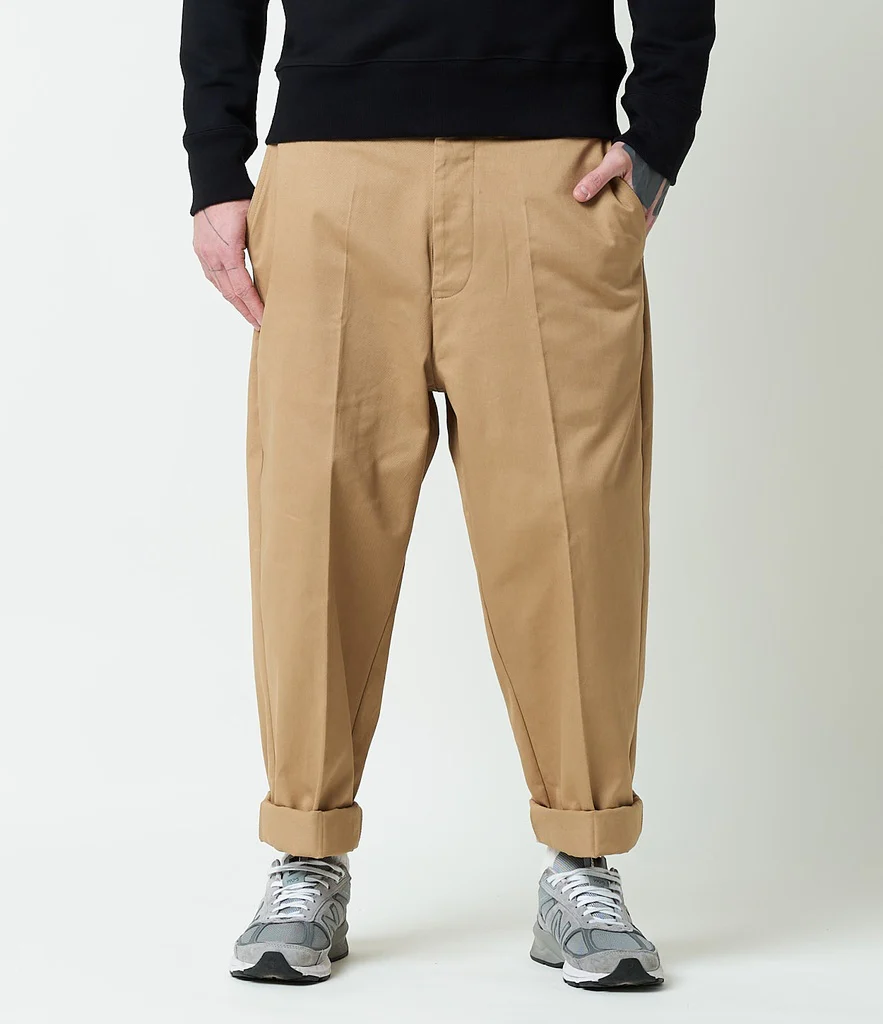 This chino has a relaxed fit with a wide leg. For women, we recommend choosing one size down compared to your regular size for the perfect fit.