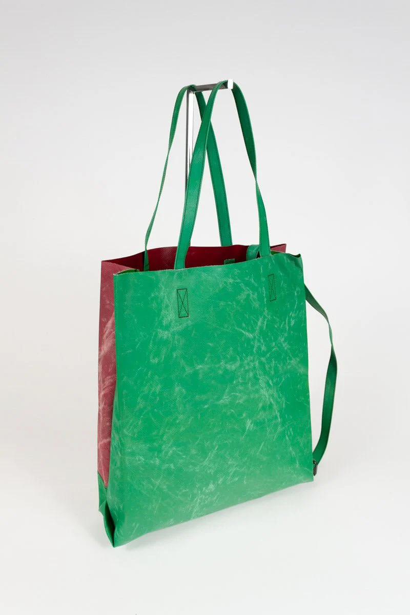 The medium TOTAL TARP TOTE. A simple strap with a snap hook boosts a simply beautiful all-tarp tote bag to a whole a new level of functionality: Wear it like a backpack and have a safe ride.